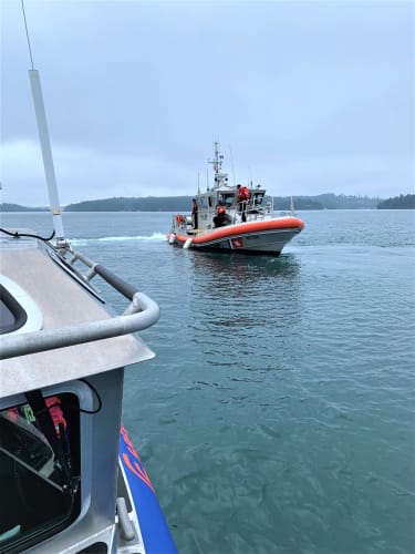 One of our important partner agencies ensuring the safety of islanders throughout our waters is the U.S. Coast Guard. This past Sunday morning, an SJIF&R marine crew accomplished an assessment of our district’s outer islands and San Juan Channel following Saturday’s tsunami advisory and surge. At the completion of the assessment, your SJIF&R marine crew linked up with a USCG 45-foot response boat from Station Bellingham in San Juan Channel to participate in two-boat training. Through mutual training opportunities we maintain our response proficiency, develop new skills and hone communication capabilities required to respond to all emergencies.